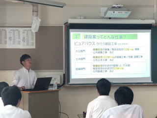 建設業とは具体的にどんな仕事なのか、 また、仕事の選び方について自身の経験を お話しさせていただきました。 |