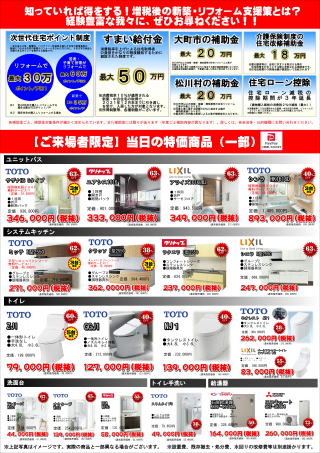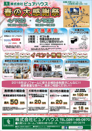 | 春の大感謝祭 日 時 2018年4月7日(土)・8日(日) 会 場 大町ショールーム(ピュアハウス 大町事務所1階) |