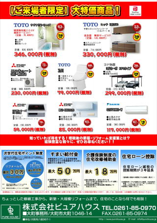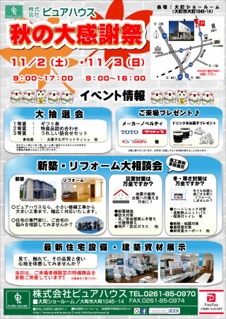 | 秋の大感謝祭 日 時 2019年11月2日(土)・3日(日) 会 場 大町ショールーム(ピュアハウス 大町事務所1階) |