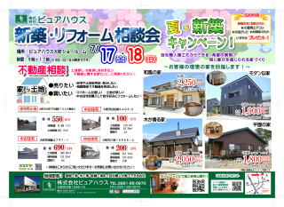 | 新築・リフォーム相談会 日 時 2021年7月17日(金)・18日(土) 会 場 大町ショールーム(ピュアハウス 大町事務所1階) |