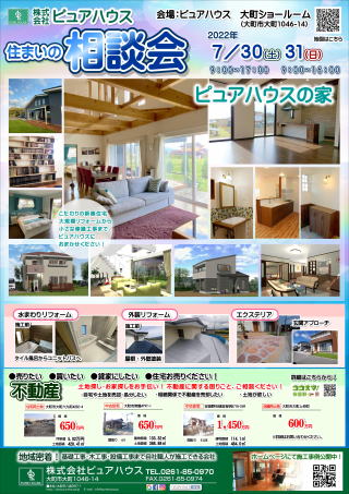 | 住まいの相談会 日 時 2022年7月30日(土)・31日(日) 会 場 大町ショールーム(ピュアハウス 大町事務所1階) |