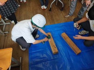 インパクトドライバーでネジ締め体験。 男子はさすが!みんなとても上手です。 女子は恐る恐るではありましたが、 みんなチャレンジしてくれました。 |