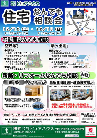 | 住宅なんでも相談会 日 時 2020年12月12日(土)・13日(日) 会 場 大町ショールーム(ピュアハウス 大町事務所1階) |
