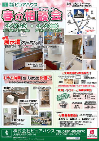 | 春の新築・リフォーム相談会 日 時 2021年4月3日(土)・4日(日) 会 場 大町ショールーム(ピュアハウス 大町事務所1階) |