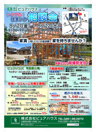| トクする!住まいの相談会 日 時 2021年5月21日(金)・22日(土) 会 場 大町ショールーム(ピュアハウス 大町事務所1階) |